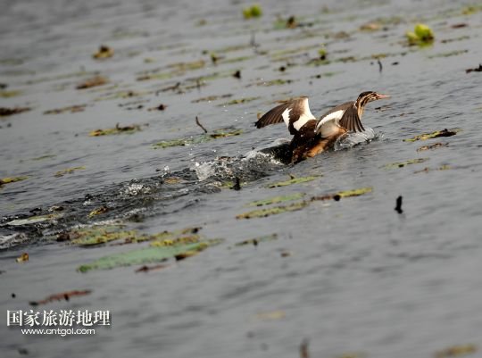8月3日,一只野鴨在那木斯萊湖水面上準備起飛。