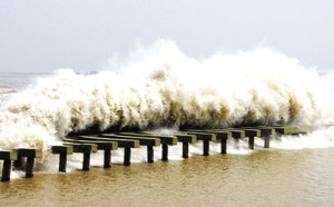 在蕭山美女壩和九號壩處,海塘轉彎,潮水沖擊丁字壩和江堤,同樣能形成“回頭潮”;錢塘江由西折向南面,到九溪珊瑚沙一帶,同樣有一條長長的江堤伸入江中,雖然潮水到達這里開始減弱,但當潮水方向與風向一致時,推波助瀾,潮浪也會很大。