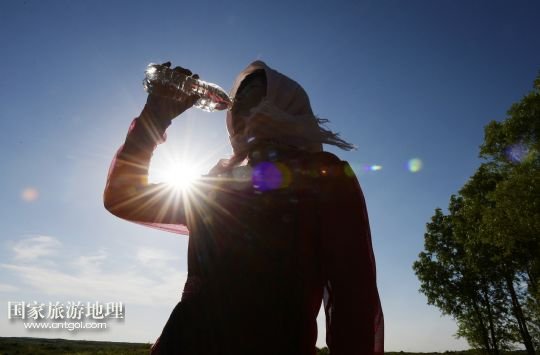 顧蕓香在植樹間歇喝水(7月23日攝)。