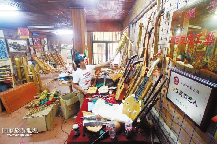 國家旅游地理 廣西柳州11月11日訊(記者陸旺楊春) 牽手漫步龍?zhí)睹琅?,并肩靠背沐浴晚秋暖陽,你會時常聽到一串串動人的音符:它時而渾厚圓潤、清脆響亮,時而輕靈縹緲、悠長凄美。不忍打破這份寂靜閑情,卻又忍不住猜想:這是何方人士,用何種樂器,吹拉彈撥出如此佳音?穿越叢林,循聲走去,瑤寨庭前,幾個年輕男女手握蘆笙,身子左搖右晃,吹得正起興。步入瑤寨一樓才發(fā)現(xiàn),這里儼然一個生產(chǎn)民族樂器的大工廠:木板、竹竿、鐵鋸、膠水、油漆,以及形狀酷似牛頭、牛腿、魚身、龍身等顏色各異、五花八門的樂器……一位正在給樂器上漆的中年人梁志榮告訴記者,這是龍?zhí)豆珗@正在籌建的民族樂器館,也是魚峰區(qū)創(chuàng)建廣西文化強(qiáng)區(qū)的特色景區(qū)之一,他現(xiàn)在是大龍?zhí)睹褡逅囆g(shù)團(tuán)團(tuán)長,研究、制作民族樂器將近20年,曾獲“廣西民間工藝大師”和“十佳民間藝人”稱號。