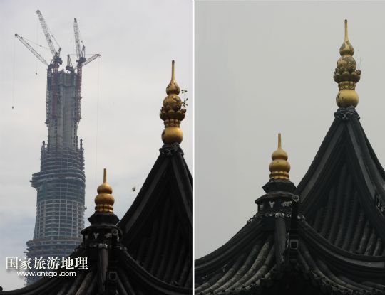 國家旅游地理 上海12月26日訊 這張拼版照片顯示的是:2013年8月3日在上海豫園拍攝的在建中的上海中心(左圖);12月26日在同一地點拍攝的上海中心“消失”在霧霾中(右圖)。當(dāng)日,上海遭遇霧霾天氣,空氣重度污染。 /新華社發(fā)(賴鑫琳 攝)