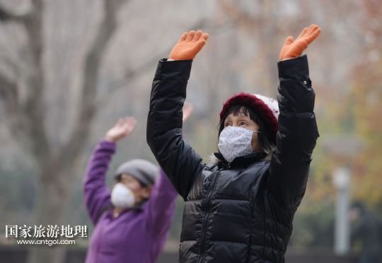12月26日,幾名老人在霧霾籠罩下的上海淮海公園晨練。