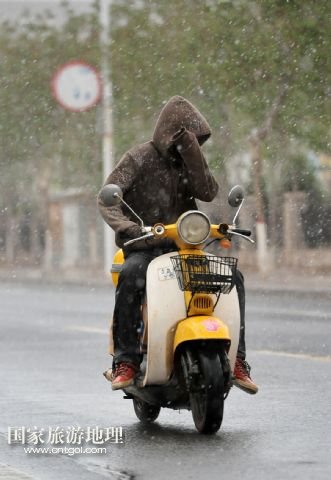 4月24日,在寧夏回族自治區(qū)中衛(wèi)市,市民正在雨雪中騎行。