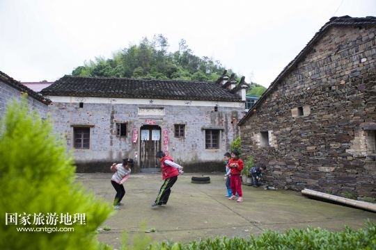 國家旅游地理 江西九江5月12日訊 5月12日,孩子們坐在土目源村的老房子前玩耍??沼牡纳焦龋幌⒌南?,斑駁的石墻,古樸的石屋。在江西省北部山區(qū),有一座石屋山居的古村落——都昌縣大港鎮(zhèn)土目源村。
