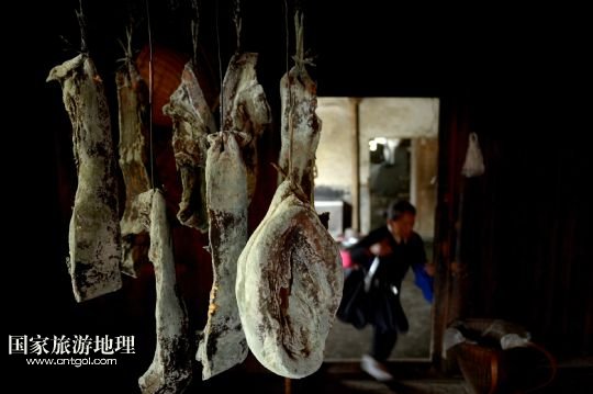 一戶(hù)板寮村農(nóng)家的屋中掛著當(dāng)?shù)氐膫鹘y(tǒng)食品——臘肉(5月22日攝)。