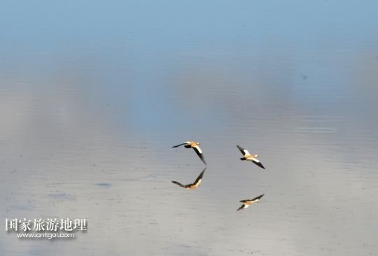6月18日,水鳥在莽措湖上飛翔。