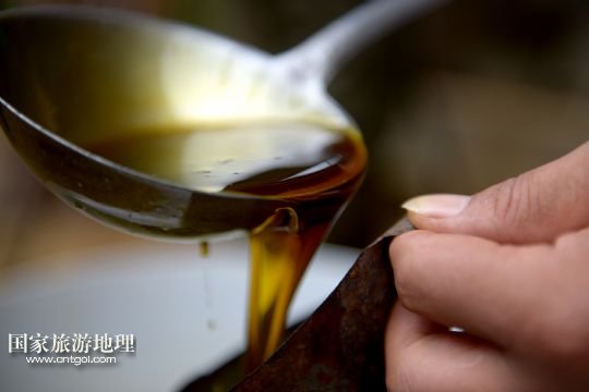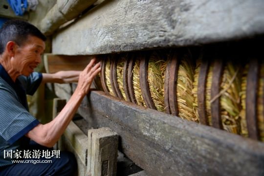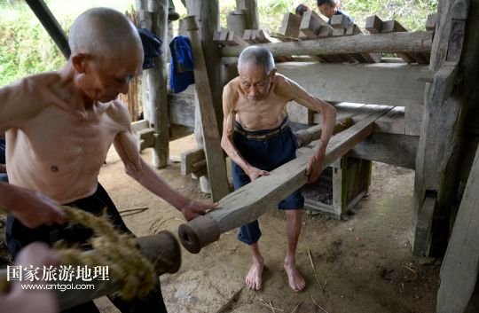 國家旅游地理 湖北恩施6月23日訊 6月21日,在湖北省宣恩縣箭竹坪村的榨油房里,“打榨佬”們揮舞撞錘猛擊楔子。紀錄片《舌尖上的中國》第二季熱播,讓片子中出現(xiàn)的手工榨油技藝進入公眾的視野。在湖北西部山區(qū)恩施土家族苗族自治州宣恩縣李家河鄉(xiāng)箭竹坪村,依然留存有手工榨油的榨房及一批身懷絕技的手藝人。
