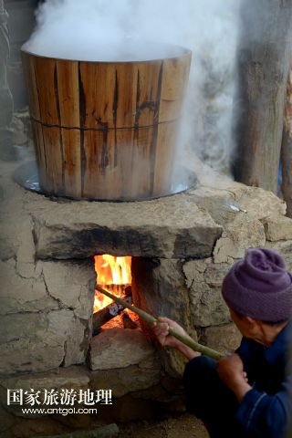 6月21日,在湖北省宣恩縣箭竹坪村的榨油房里,“打榨佬”將碾細的菜籽放入木甑猛火蒸熟。