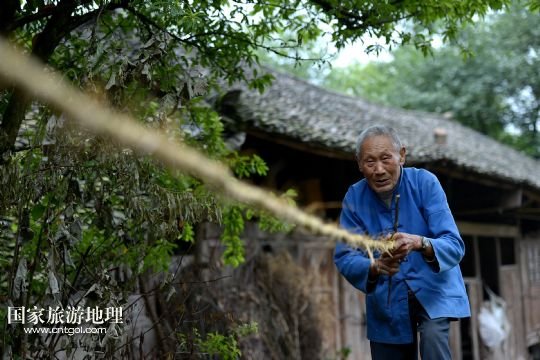 6月21日,在湖北省宣恩縣箭竹坪村的榨油房里,78歲的“打榨佬”侯仕松在編掛撞錘的草繩。