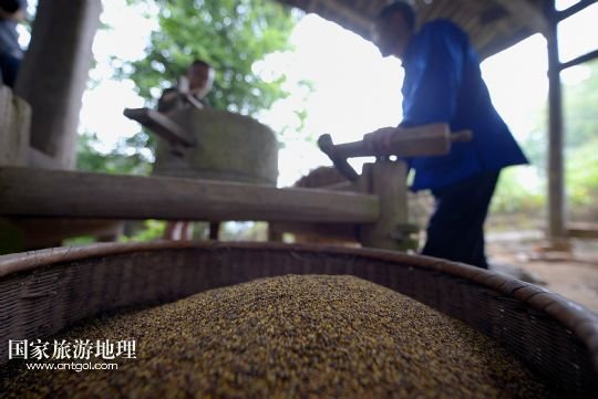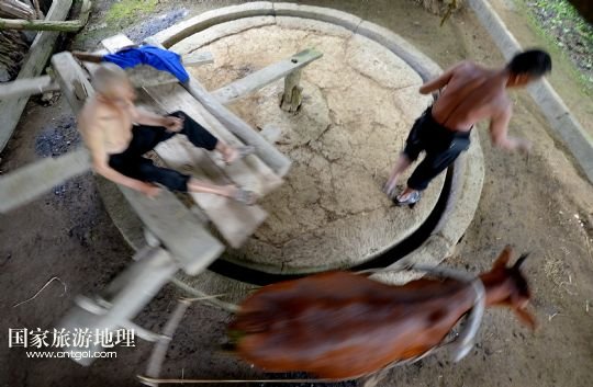 6月21日,在湖北省宣恩縣箭竹坪村的榨油房里,“打榨佬”們用牛拉石碾子將菜籽碾細。