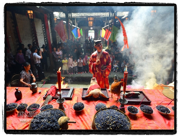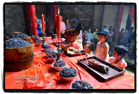 國家旅游地理 江西婺源(上饒)5月31日訊(特約記者王國紅 通訊員程新德攝影報道) “祭祀開始、鳴炮奏樂、祭拜、主持人講話、結(jié)束鳴炮”,5月25日,農(nóng)歷四月初八,石佛村烏飯節(jié),村民將自家精心制作的烏飯端進(jìn)祠堂祭祀。江西省婺源縣段莘鄉(xiāng)石佛村每年都要舉行烏飯祭祖活動,各家各戶將自家精心制作的烏飯端進(jìn)祠堂……
