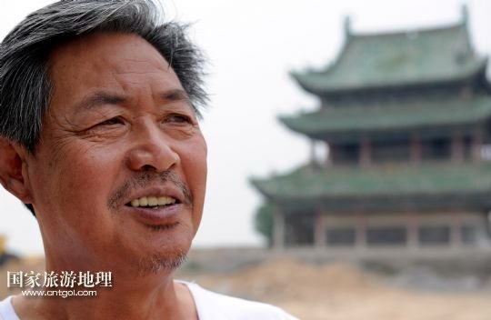6月18日,陜西省文物保護員李潤倉在向游人介紹宋祠修繕情況。今年已63歲的他30年如一年,義務看管保護唐塔和宋祠,被傳為佳話。